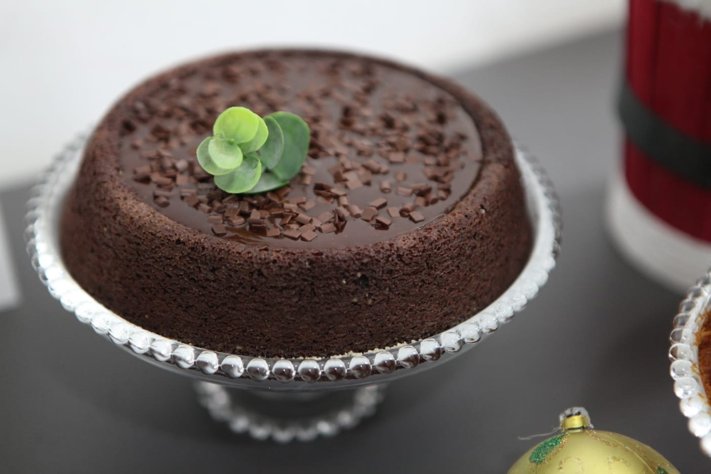 Redondo. Não tem farinha. Leva uma calda de chocolate 70% cacau. |