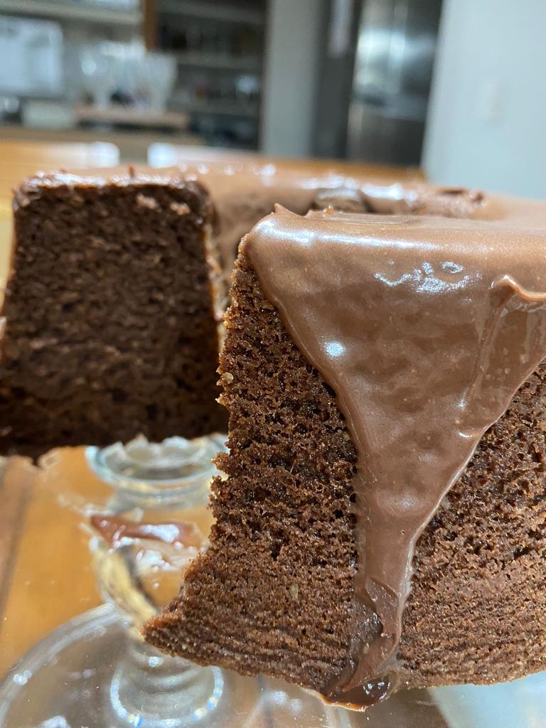 | Bolo de Chocolate isento de farinha. Com calda de chocolate. |